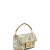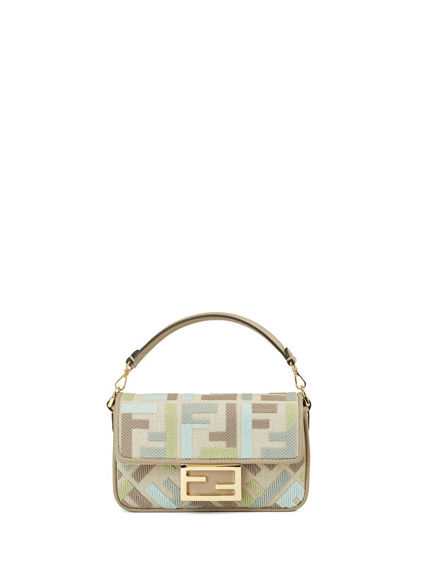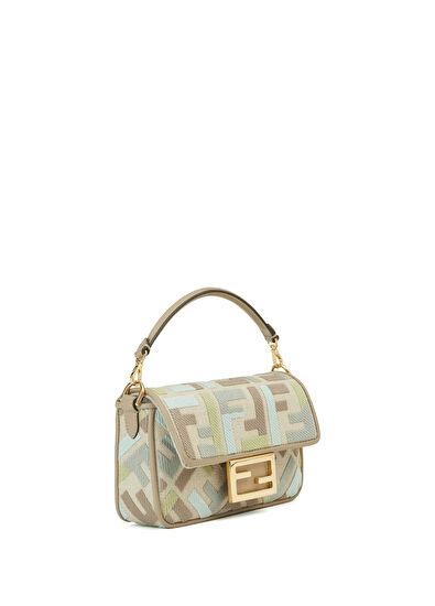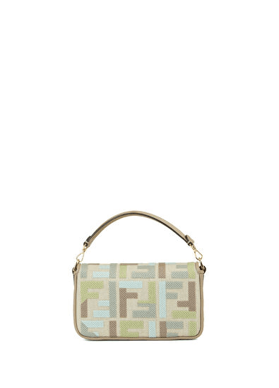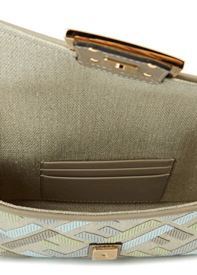 Add a pop of color and texture to your collection with this iconic baguette-style mini bag in a refreshing matcha green linen-blend canvas. Embroidered with a vibrant multicolor pattern inspired by luxury fashion houses, this structured bag features an embossed motif, dove grey calfskin trim, and a gold-finish metal FF-style clasp that exudes sophistication.